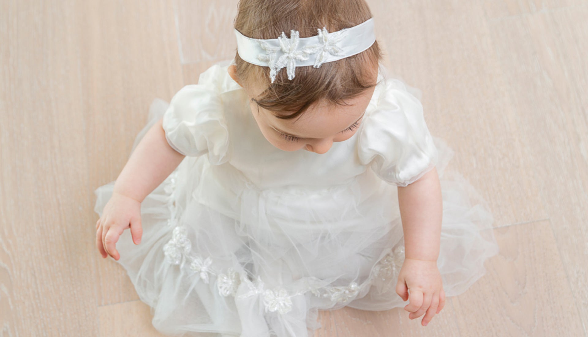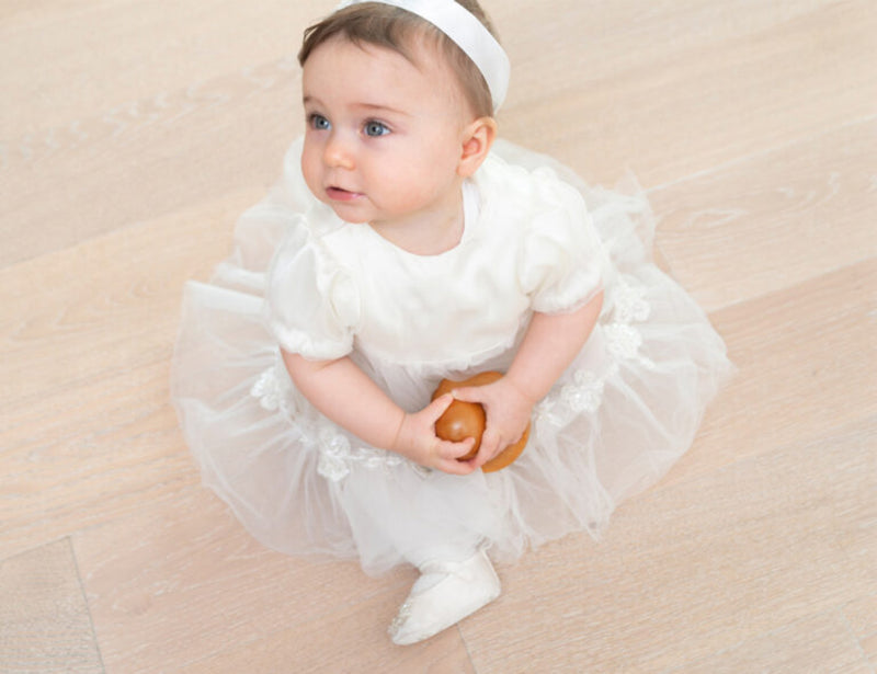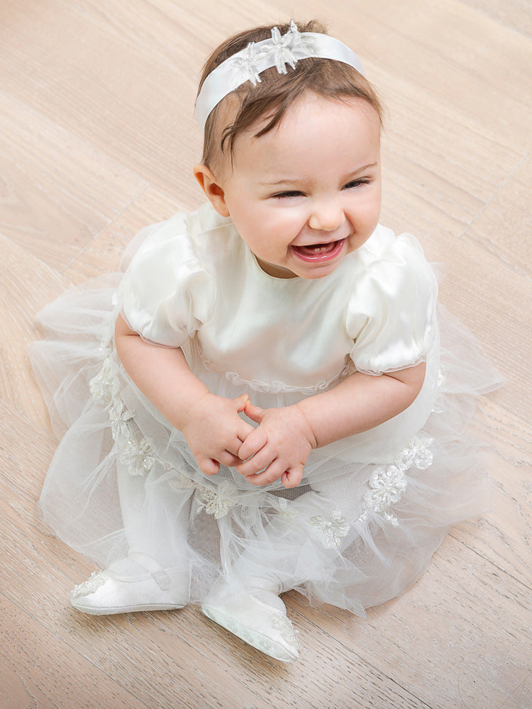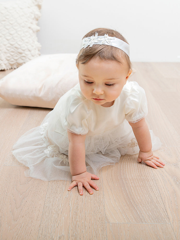 Made of soft silk satin and tulle, this little dress features floral embroidery