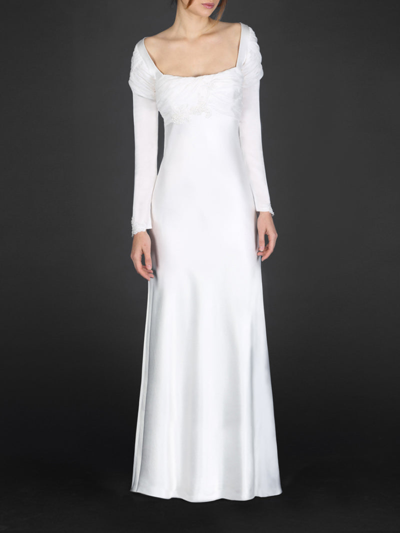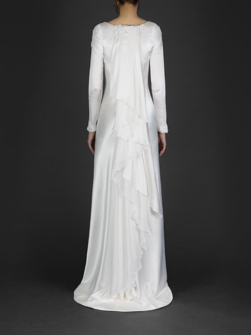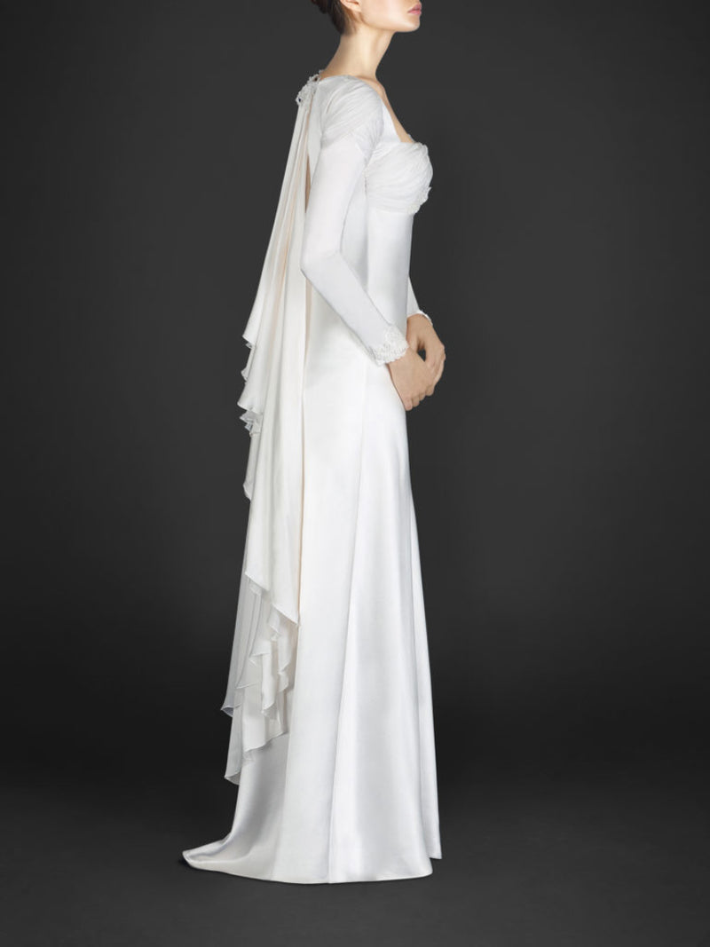 Full-length satin sleeve to give a sense of purity, but meticulous chiffon pleating to enhance the bride’s cleavage along with delicate pearl embroidery. A zigzag cape descends on the back, alternating impalpable chiffon with shimmering satin. This kind of revisited train floats as lightly as an angel’s wings with each breath of wind.