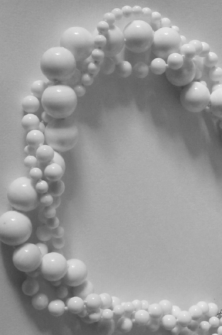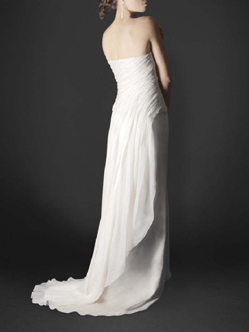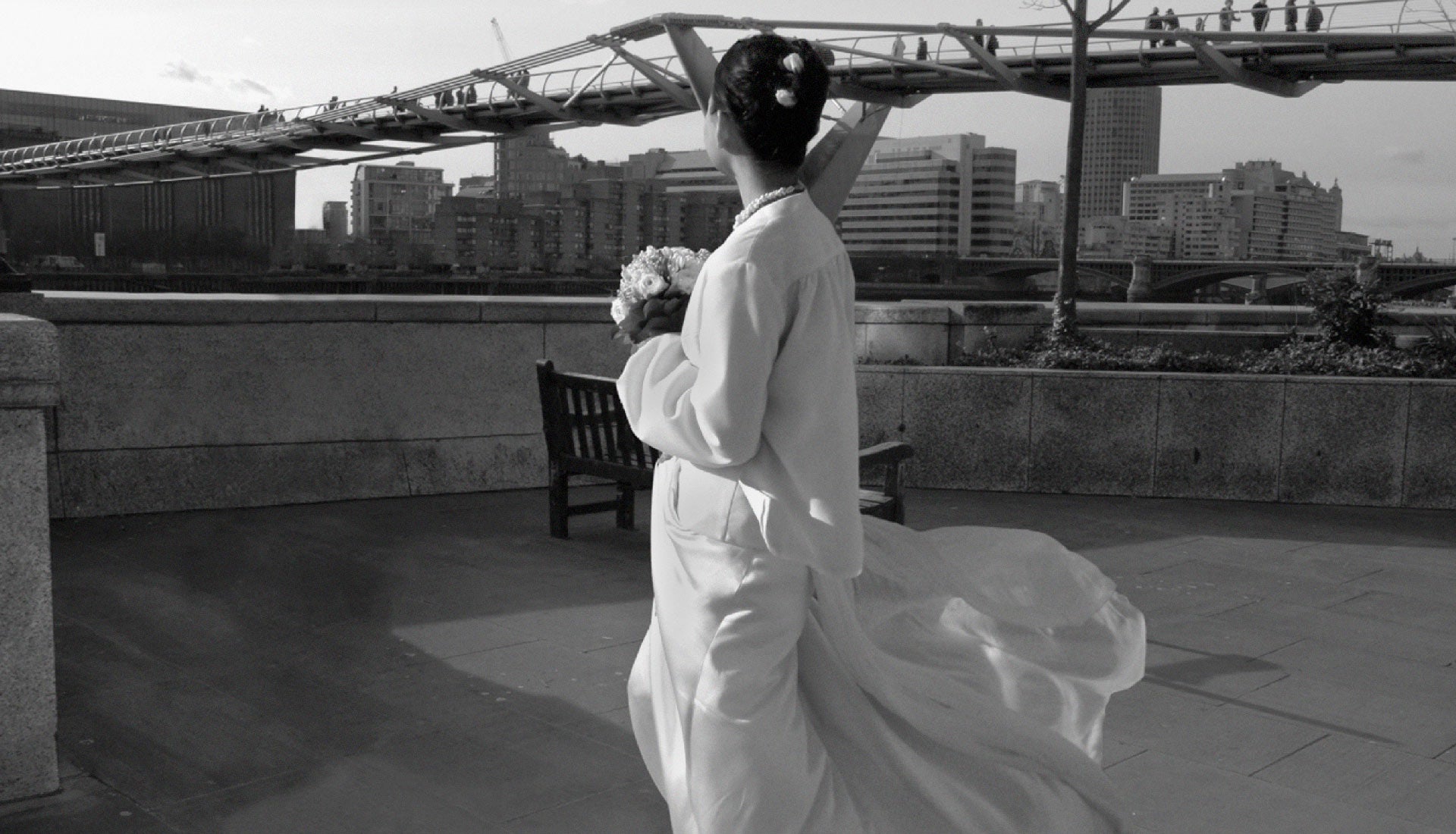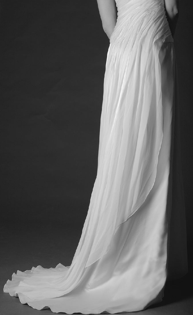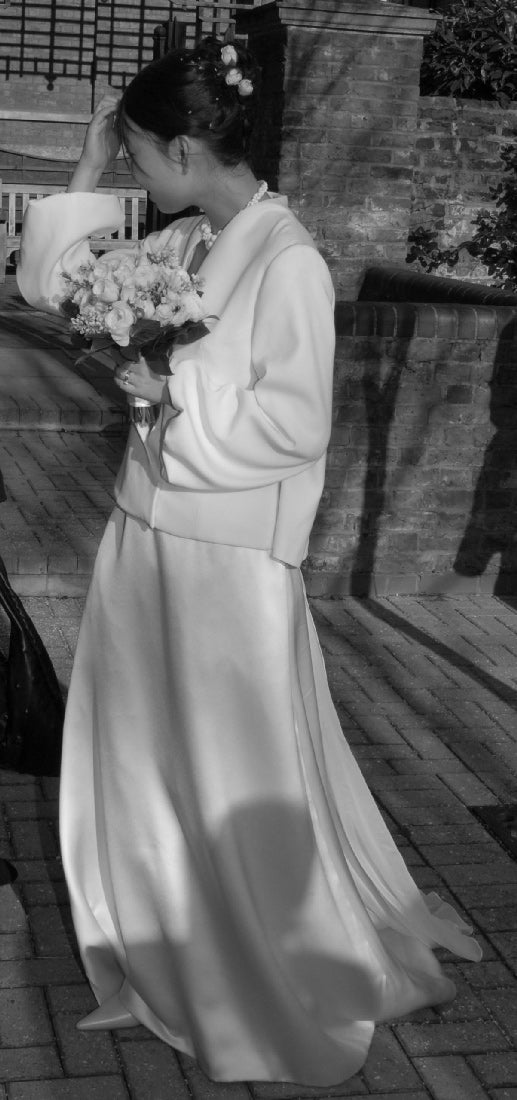 This sharply cut wedding dress mixes architectural accents with an ethereal atmosphere and draws inspiration from the waves of the sea. Keli wanted a dress that was full of emotion, but at the same time simple. Impalpable silk chiffon wraps a sheath dress in silk satin. It falls softly on the back of the dress to float in the wind like a wave of the sea. For a winter wedding on the banks of the Thames, we designed a jacket with a graphic cut that goes harmoniously with the tail of the dress with soft pleats. Our fossil ivory ball necklace completes the bride. Pearls of different sizes resemble the froth of sea waves.