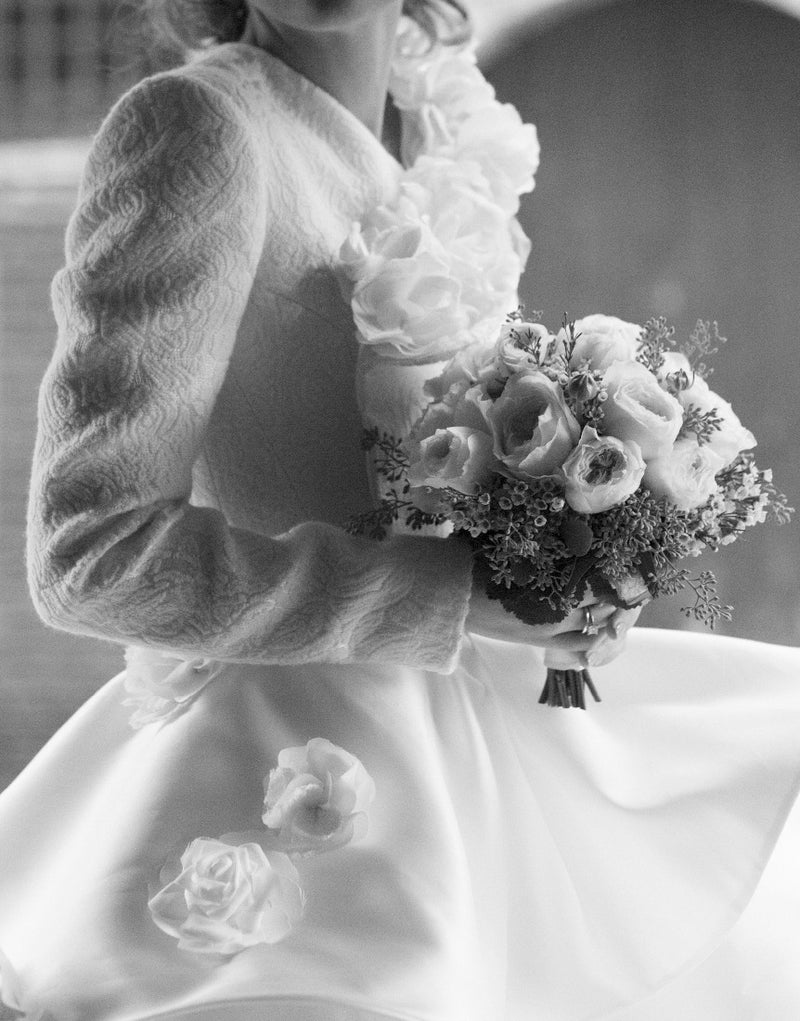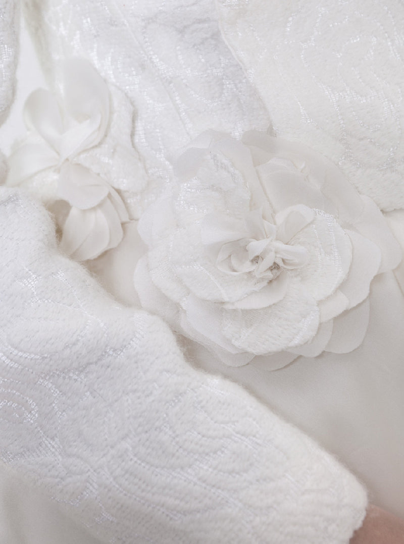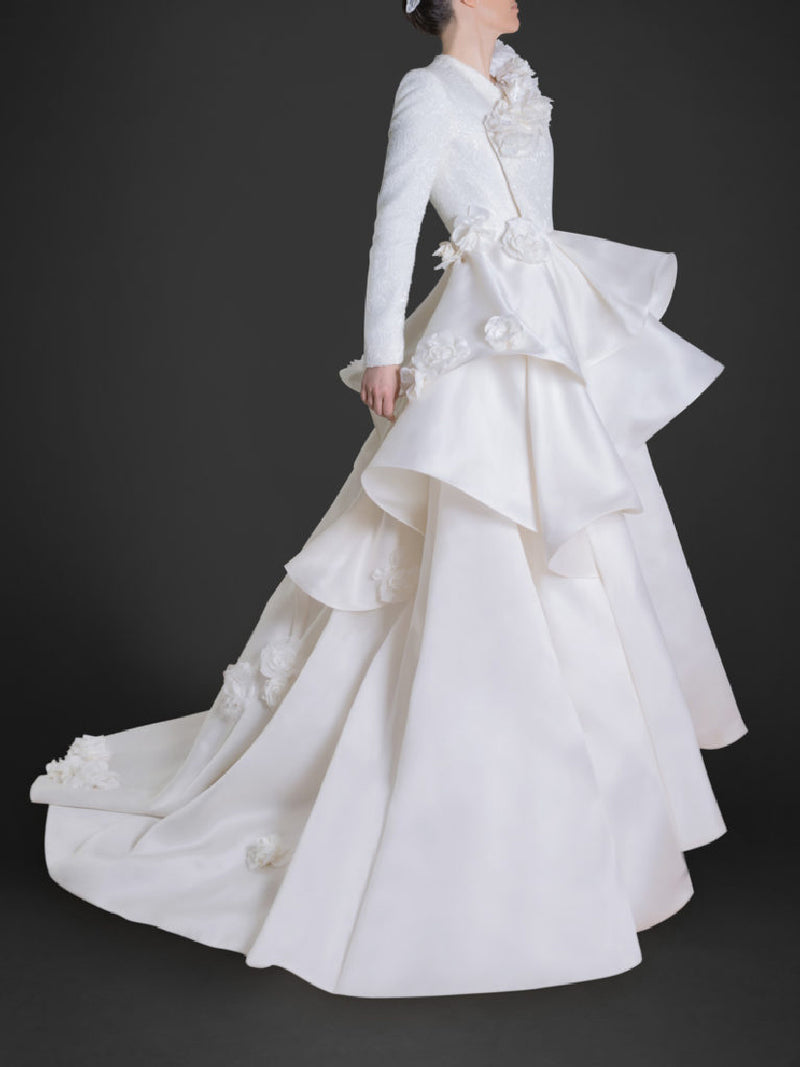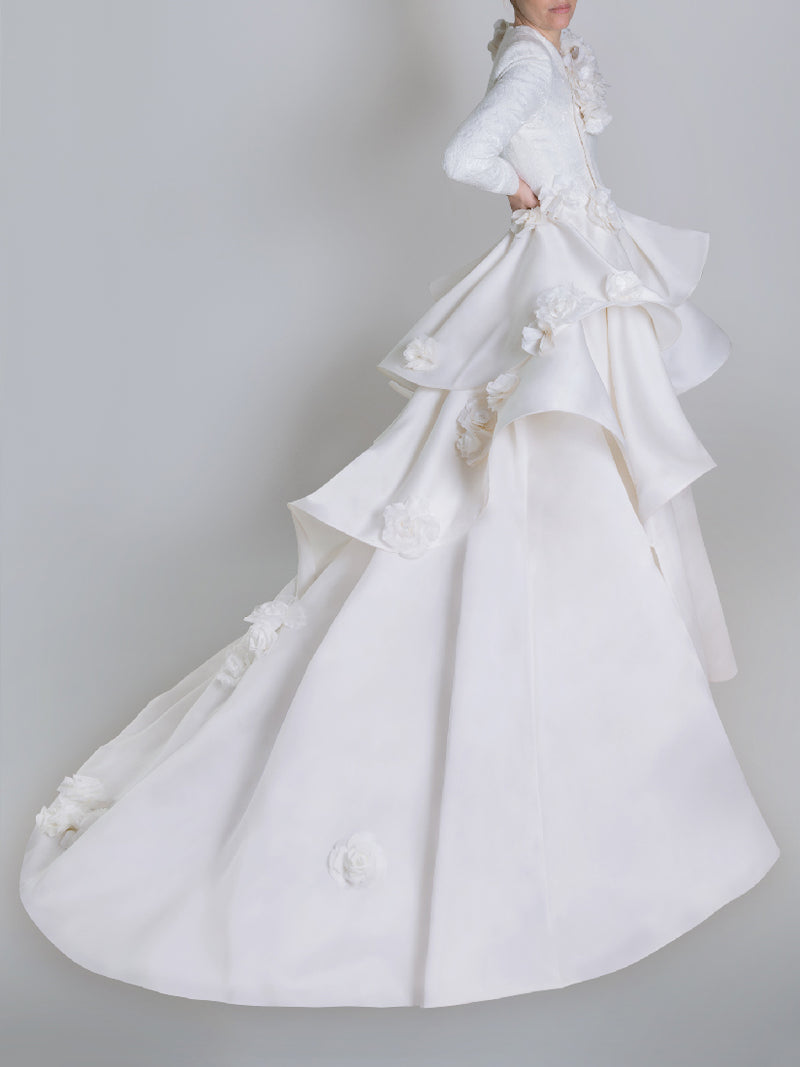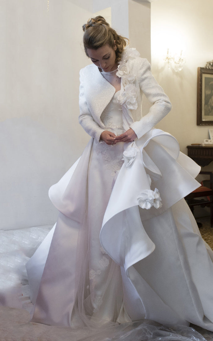 I designed this coat-dress for my wedding. Inspired by a rose garden that could bloom as if by magic in the winter fog of Venice, the coat unfolds as one of the white roses that, in turn, decorate its voluminous skirt. More roses appear and disappear in the damask weave of the jacket and finally emerge full from the neckline in a riot of wool petals, organza and satin. A soft wool-silk damask jacket supports the wide gazar skirt. Together they give life to this double-breasted coat. The sculptural structure with soft scrollwork pays homage to Venetian Baroque.