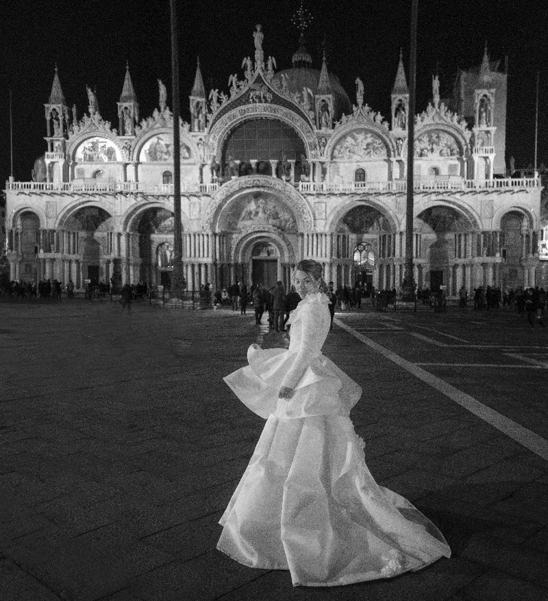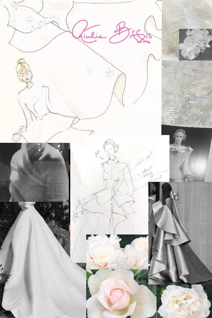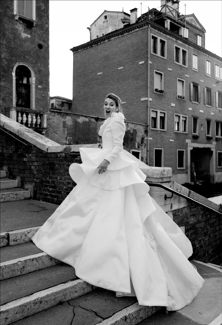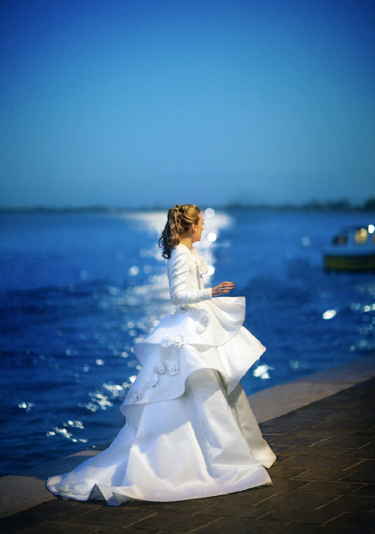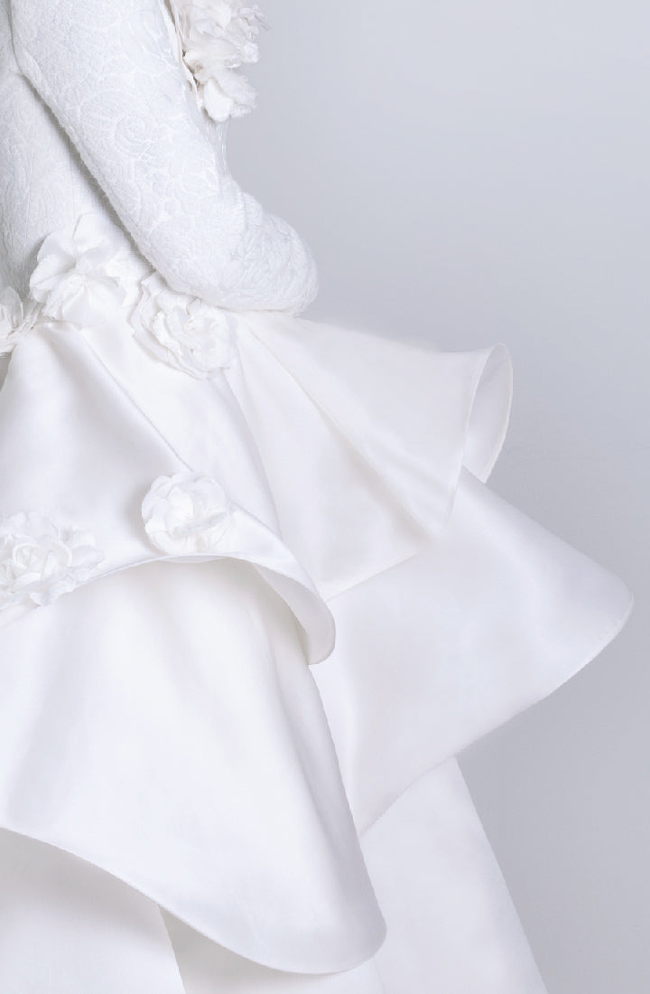 I designed this coat-dress for my wedding. Inspired by a rose garden that could bloom as if by magic in the winter fog of Venice, the coat unfolds as one of the white roses that, in turn, decorate its voluminous skirt. More roses appear and disappear in the damask weave of the jacket and finally emerge full from the neckline in a riot of wool petals, organza and satin. A soft wool-silk damask jacket supports the wide gazar skirt. Together they give life to this double-breasted coat. The sculptural structure with soft scrollwork pays homage to Venetian Baroque.